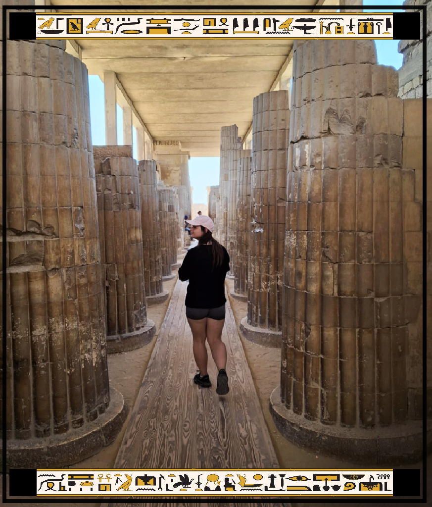 Ostatniego dnia naszego pobytu zdecydowaliśmy się na dalszą wycieczkę do Daszur. W tym przypadku również chcieliśmy skorzystać z Ubera jednak okazało się że nie jest tam dostać się tak łatwo jak nam się wydawało, bo z miejsca, w którym moglibyśmy wysiąść musielibyśmy iść jeszcze kilka kilometrów piechotą. Jednak nasz kierowca zaproponował nam, że pojedzie tam z nami jako nasz „przewodnik”, dzięki czemu mogliśmy odwiedzić to miejsce. Daszur to jedno z najważniejszych archeologicznych miejsc w Egipcie, położone około 40 km na południe od Kairu, w pobliżu Gizy. Znane jest przede wszystkim z dwóch starożytnych piramid, które są częścią tzw. „piramidowych nekropolii” Egiptu. Daszur jest często pomijane przez turystów na rzecz bardziej znanych piramid w Gizie, ale oferuje wyjątkowe wrażenia i mniej zatłoczone otoczenie.Najbardziej znana jest widoczna na zdjęciu Piramida Schodkowa , której nietypowa budowa wynika z faktu, że początkowo miała kąt nachylenia 54°, ale z powodu strukturalnych problemów projekt zmieniono na mniej stromy (43°). To właśnie w tej piramidzie widać ewolucję konstrukcji piramid w starożytnym Egipcie, kiedy architekci eksperymentowali z różnymi technikami budowy.