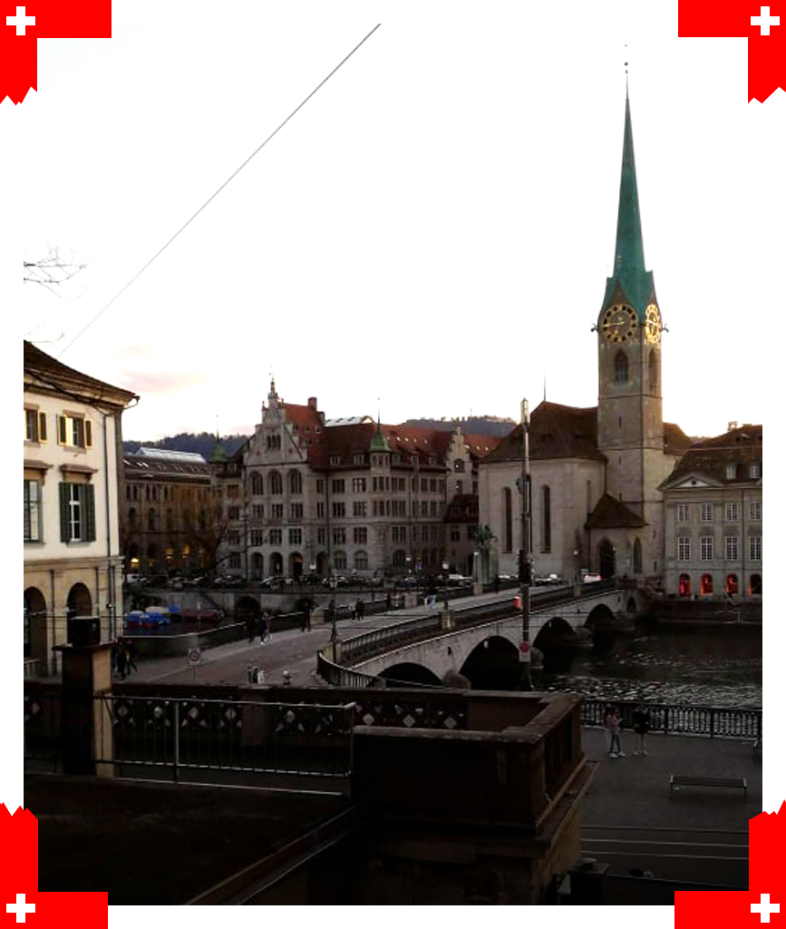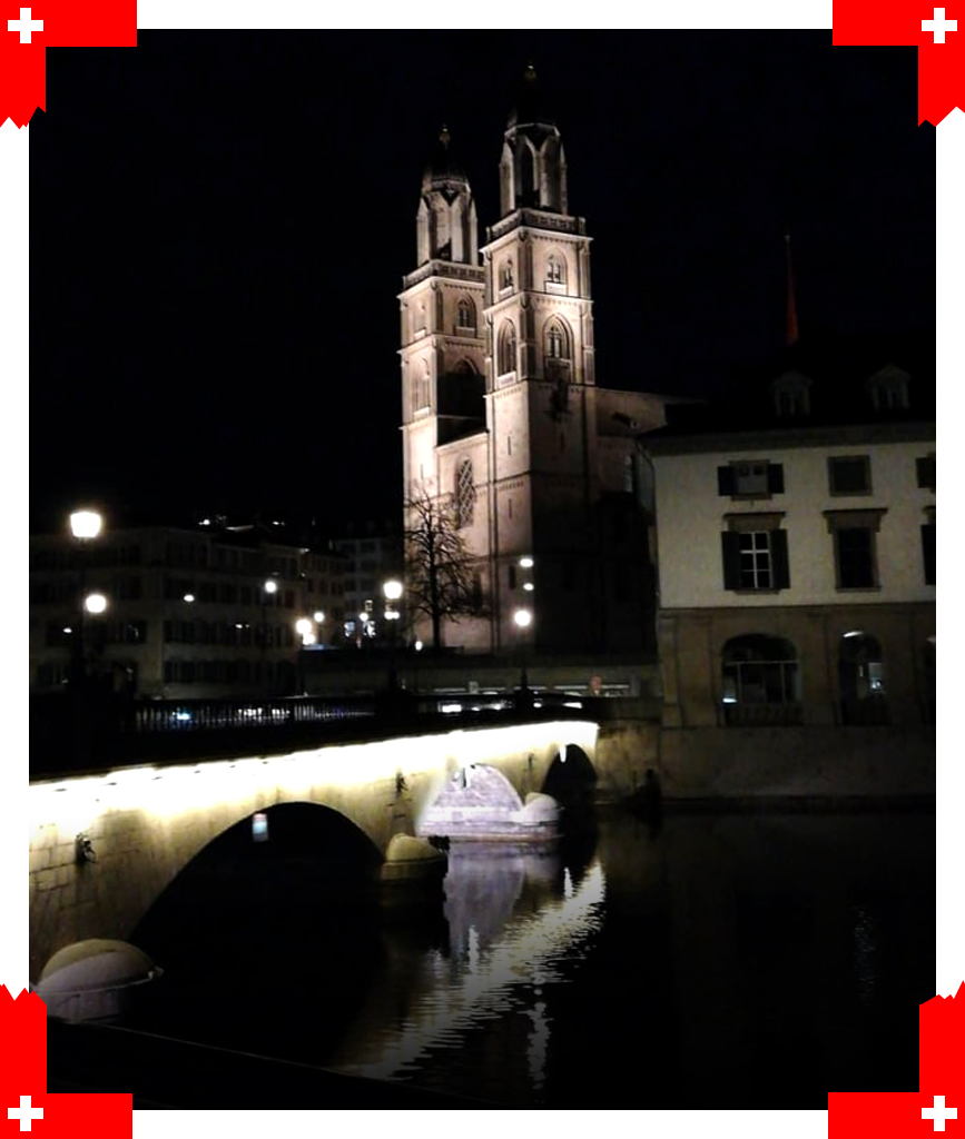 Po punkcie widokowym udaliśmy się na coś do jedzenia a następnie przeszliśmy się na spacer. Jako, że w Zurychu byliśmy na początku marca, to po wyjściu z restauracji zrobiło się już dosyć ciemno. Postanowiliśmy zobaczyć jeszcze Grossmünster- „kościołem-matką” reformacji w niemieckojęzycznej Szwajcarii. To właśnie tutaj od 1519 do swojej śmierci w 1531 Zwingli wzywał do odnowy chrześcijaństwa. Bliźniacze wieże kościoła pochodzące z XV w., zwieńczone XVIII-wiecznymi kopułami, są najbardziej charakterystycznym elementem zuryskiej architektury.